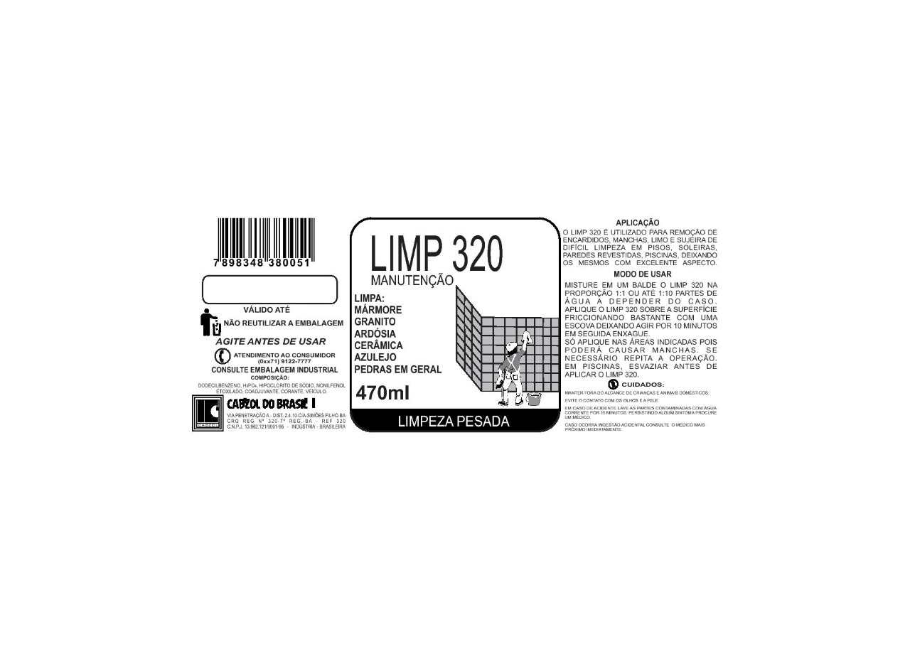LIMP 320-A pode ser aplicado puro ou diluído em até quatro partes de água, a depender de cada caso. Espalhe o LIMP 320-A em toda superfície a ser tratada, friccione bastante com auxílio de uma escova de nylon ou trapo. Deixe o produto atuar por 5 a 10 minutos, enxágüe com bastante água. Repita a operação caso seja necessário.